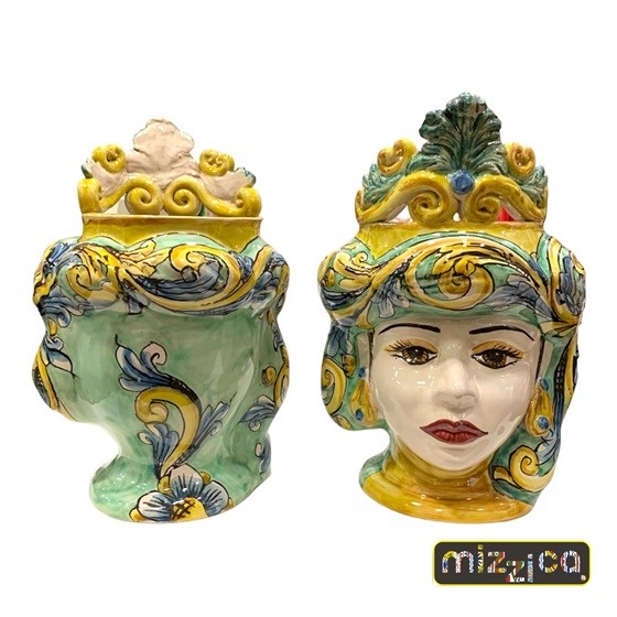 Teste di moro in ceramica di Caltagirone, realizzate a mano da artigiani esperti. Le teste sono alte 23cm (più 9cm la corona). Il modello è classico con turbante e corona. I colori principali del decoro sono giallo, blu e verde.