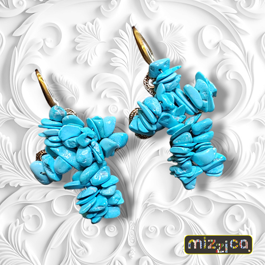 La croce in filigrana di ottone color oro è impreziosita da chip di turchese cuciti uno ad uno con cura artigianale. La chiusura a monachella in acciaio color oro garantisce comfort e sicurezza.