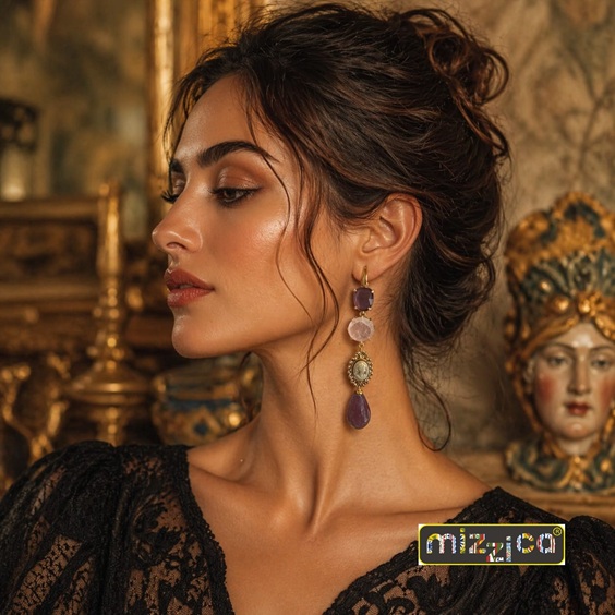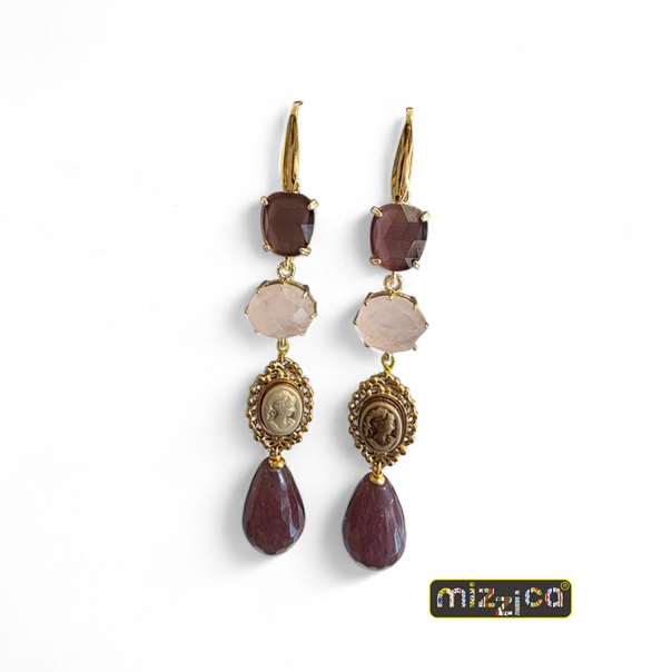 Eleganti e raffinati, questi orecchini sono realizzati con monachella in ottone galvanizzato color oro, che dona luminosità e resistenza nel tempo. Il design è arricchito da una combinazione armoniosa di elementi: un cristallo sfaccettato, un delicato quarzo rosa, un piccolo cameo centrale dal fascino vintage e una goccia finale in quarzo dalle tonalità calde. La composizione crea un equilibrio perfetto tra romanticismo e carattere, rendendo questi orecchini ideali sia per il giorno che per la sera.