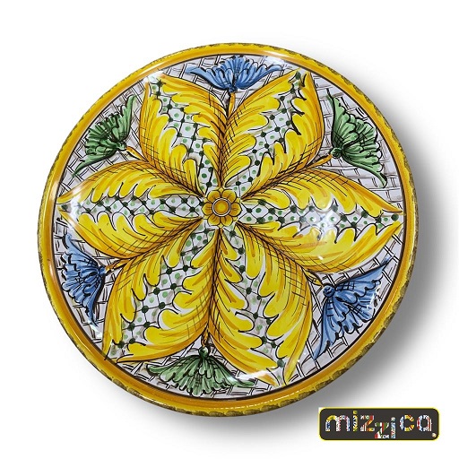 Piatto in ceramica di Caltagirone, dipinto a mano con un tradizionale disegno calatino.