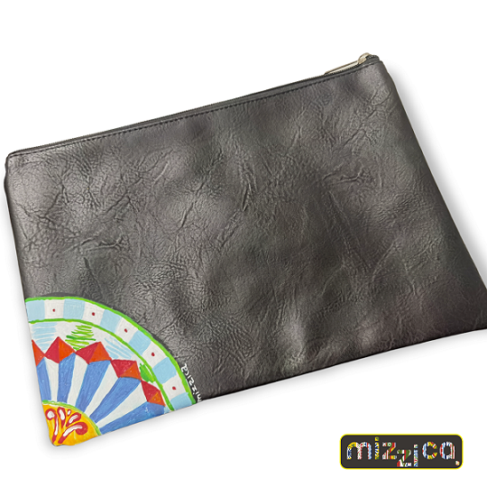 Pochette unisex in eco-pelle nera, dipinta a mano con disegno tipico Siciliano:  Ruota di Carretto Siciliano.