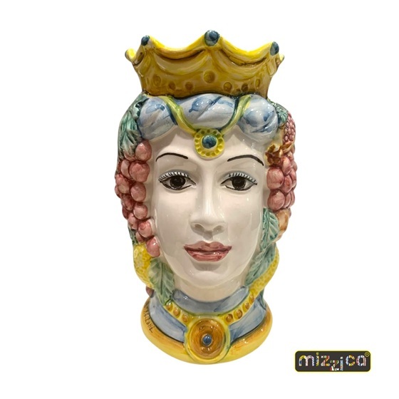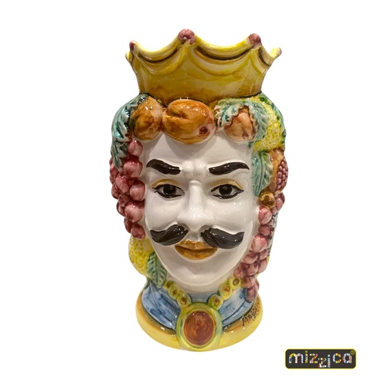 Raffinata creazione artigianale in ceramica di Caltagirone, questa testa di Moro doppia presenta su un lato il volto delicato di una donna, sull’altro quello fiero di un uomo. Il design classico è arricchito da vivaci decorazioni con frutta e foglie in rilievo.
